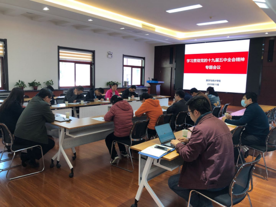 与会成员均结合自身工作实际,畅谈感想,并从科研、教学、“跑五”等多方面提出意见建议。副院长肖燕妮结合近期工作谈了科研创新的重要性,并表示十九届五中全会对科技工作者提出了更高的要求,我们应始终坚持“四个面向”,从解决实际问题出发,将数学真正‘应用’到国家重大需求和人民生命安全上。副院长易媛谈了对十九届五中全会精神的理解,并表示近年来学院在人才培养取得了一些成绩,但在专业教学建设方面还需调动一切积极因素,积极谋划,进一步提升人才培养质量。孙建永表示,通过近期的交流,有很强的危机感,作为高校教师必须要走出去,掌握国家发展趋势,积极“跑五”,争取更多的合作契机和发展机遇。王飞结合自己经历谈了对创新的理解,表示应积极引导学生树立创新意识和沟通合作意识,学会用数学去推进实际问题的解决。张正策表示基础学科应主动去交叉、合作,加强沟通交流,争取更大的发展空间。李辉从一流专业教材建设和人才引进方面谈了自己的建议意见。刘小川表示,作为基础学科,应倡导师生潜心做好科研工作,也希望学校、学院能为师生营造更加宽松的学术氛围,鼓励师生静下心把冷板凳坐热。