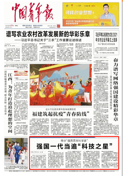 今年8月,中国青年报社联合中国科协科学技术传播中心、顺德区人民政府等相关单位,开展2021“强国青年科学家”寻访活动,旨在弘扬科学精神,致敬科技先锋,引导青少年树立正确的价值观,让更多青少年知道“这才是我们该追的星”。杨永飞就是寻访到的10名“强国青年科学家”之一。