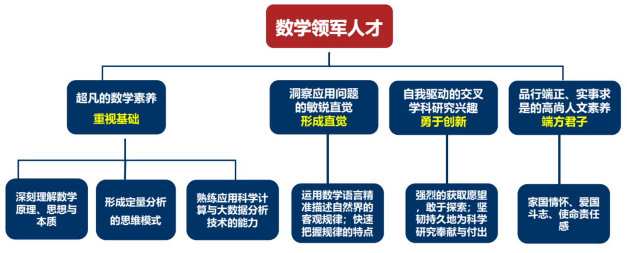 数学拔尖人才培养将继续引领学生树立面向人类未来发展、国家战略需求、基础学科前沿的使命责任,着力培养学生立足科技前沿、凝练重点研究方向、探索重大科学问题的学术驱动力;培养学生以科学问题为导向、以应用问题为驱动、强化学科交叉的实践创造力;培养学生具有全球化思维、协同创新能力的国际视野;培养学生扎根祖国、服务社会、传承弘扬优秀传统文化的家国情怀。