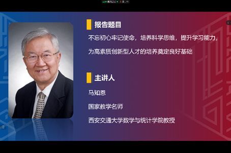 随后是两场精彩的学术报告。马知恩教授以“不忘初心牢记使命,培养科学思维,提升学习能力,为高素质创新型人才的培养奠定良好基础”为题,介绍了初等数学学习和高等数学学习的差异,并通过微积分的具体问题告诉同学们怎样领会问题的实质,怎样领会科学的思维方法。马老师希望参加英才计划的学生能够通过知识的学习提升自己的科学思维、科学素养和学习、研究与应用的能力,为今后的创新创业打好基础。