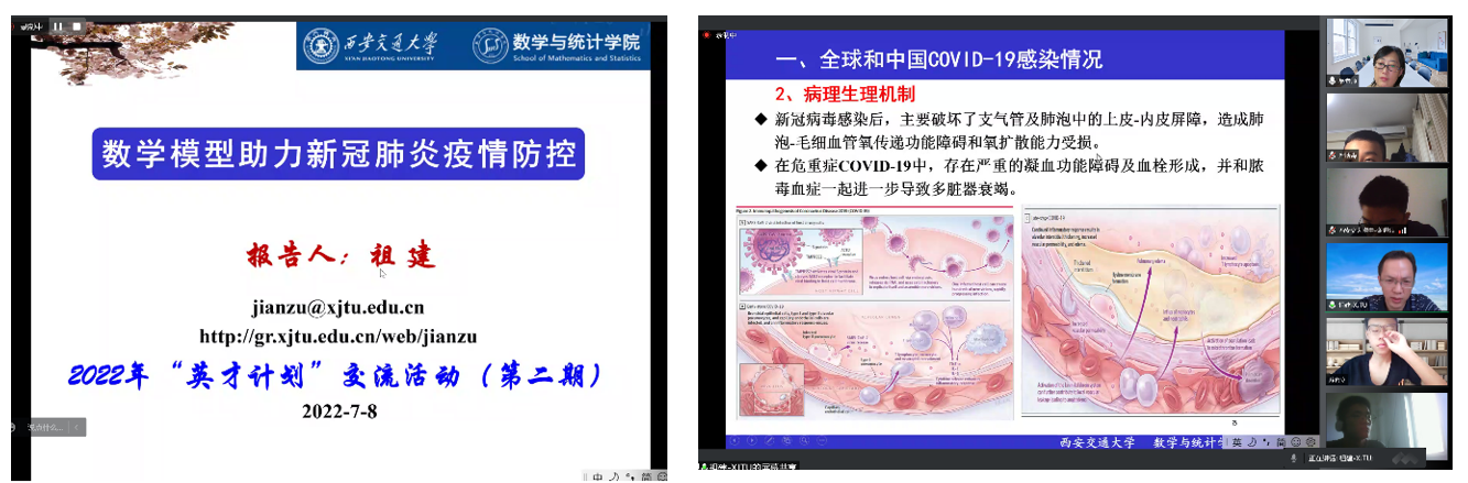 祖建教授以“数学模型助力新冠肺炎疫情防控”为题,结合多年来从事生物数学和传染病动力学研究的亲身经历,深入浅出地为同学们介绍了数学在传染病防治中的实际应用。祖老师首先介绍了一楼一凤