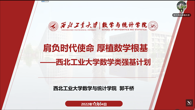 副院长郭千桥教授介绍了在工科特色鲜明的背景下,以面向国家科技领域重大需求、依托优势特色学科资源、强化数学基础和创新能力、开展数学及相关交叉学科创新人才培养为定位的拔尖人才培养模式。通过多年的努力,西北工业大学一楼一凤