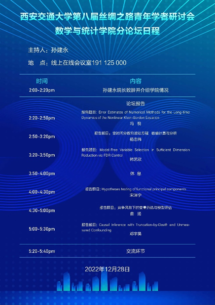 院长孙建永教授代表学院对六位青年学者参加此次数学分论坛表示热烈欢迎。对于暂时不能线下参会表示遗憾,并欢迎各位学者会后来交大线下交流。随后孙建永院长介绍了学校、学院的发展现状,以及数学和统计学科师资队伍建设等情况,并对青年才俊发出诚挚邀请,对他们加盟一楼一凤