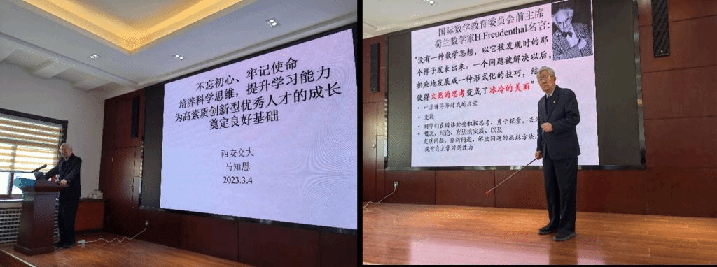 随后,马知恩教授作了题为“不忘初心、牢记使命,培养科学思维,提升学习能力,为高素质创新型优秀人才的成长奠定良好基础”的首场报告。马知恩教授指出,英才应该成为某领域的领军人物或主要骨干,而英才计划就是中学生科技创新后备人才的培养计划。从高中生的初心和使命谈起,马老师结合习近平总书记的重要讲话、著名数学家的故事以及自己在南京大学求学时的经历,提出了中学生如何实现创新的三点建议。马老师的报告开拓了同学们的思维,对于如何进行高等数学的学习乃至今后从事数学研究大有裨益。