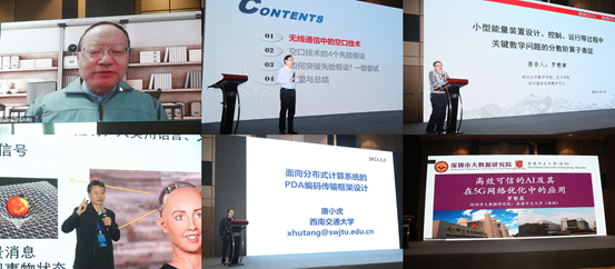 本次大会特别邀请数学、通信和人工智能领域的顶级专家学者进行了七场主旨报告,内容涵盖未来智能无线通信,信息论,分布式计算,分数阶算子,高效可信AI等。马志明院士分享了与华为合作的历程,介绍了近年来利用概率统计的工具在极化码研究方面的重要成果。在《关于智能空口数学技术的探索》主旨报告中,徐宗本院士指出目前空口技术长期存在的四个先验假设,并介绍了西交-华为数学技术联合实验室在突破这四个先验假设方面的代表性成就。罗智泉院士围绕5G网络中高效可信AI的应用问题给出了全新的数学模型及有效求解算法,从仿真平台设计,优化算法,鲁棒泛化等角度介绍了高效可信AI在5G网络参数设置中的重要作用。华为专家杨刚华在报告《先进无线新征程》中,针对6G愿景、潜在应用、基础理论创新与挑战等问题阐述了对于未来6G发展的展望与规划。罗懋康教授介绍了分数阶算子在小型能量装置设计、控制、运行等过程中的应用,从应用数学的角度分析了分数阶算子在关键问题数学建模中的重要作用。石光明教授则再次探讨了信息的基本概念内涵,探讨了从香农信号信息论向语义信息论的转变,提出了面向信息内容传输的语义通信框架。唐小虎教授针对目前海量数据的分布式计算问题,提出了基于PDA编码的传输框架,大幅减少计算节点数据交互导致的带宽开销。