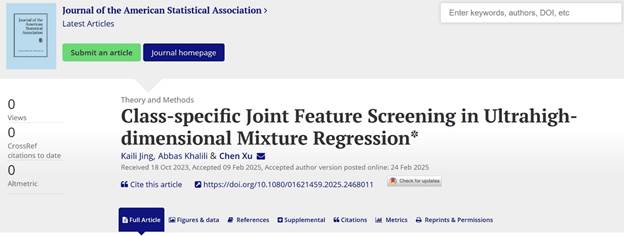 博士后研究员靖凯立在教授的指导下,在统计学四大国际顶级期刊之一的Journal of the American Statistical Association (JASA)上在线发表论文“Class-specific Joint Feature Screening in Ultrahigh-dimensional Mixture Regression”()。JASA是美国统计学协会主办的统计学科期刊,是统计学领域具有高度影响力与广泛认可度的国际顶尖杂志之一。
