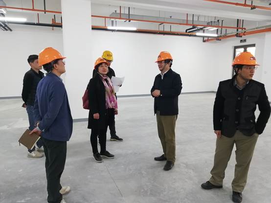 在创新港工作人员和陕建项目负责人的带领下,老师们实地走访了数学学院所在地——四号巨构北楼,并逐层进行实地考察。四号巨构北邻渭河,高大的拱门巍然屹立,楼体红白相间,在艳阳的照耀下格外光彩。在实地考察的过程中,各研究中心及实验室负责人详细询问了房屋承重情况、新风设施和供电条件,并就实验平台搭建,设备运行条件等展开深入讨论;创新港工作小组逐间丈量了房屋尺寸,为细化论证二次装修方案做准备。各中心负责人还根据师生人数、所需搭建的科研和教学实验平台情况,就如何高效地利用现有面积进行讨论和交流,并为下一步的装修和搬迁工作提供了许多宝贵的建议。