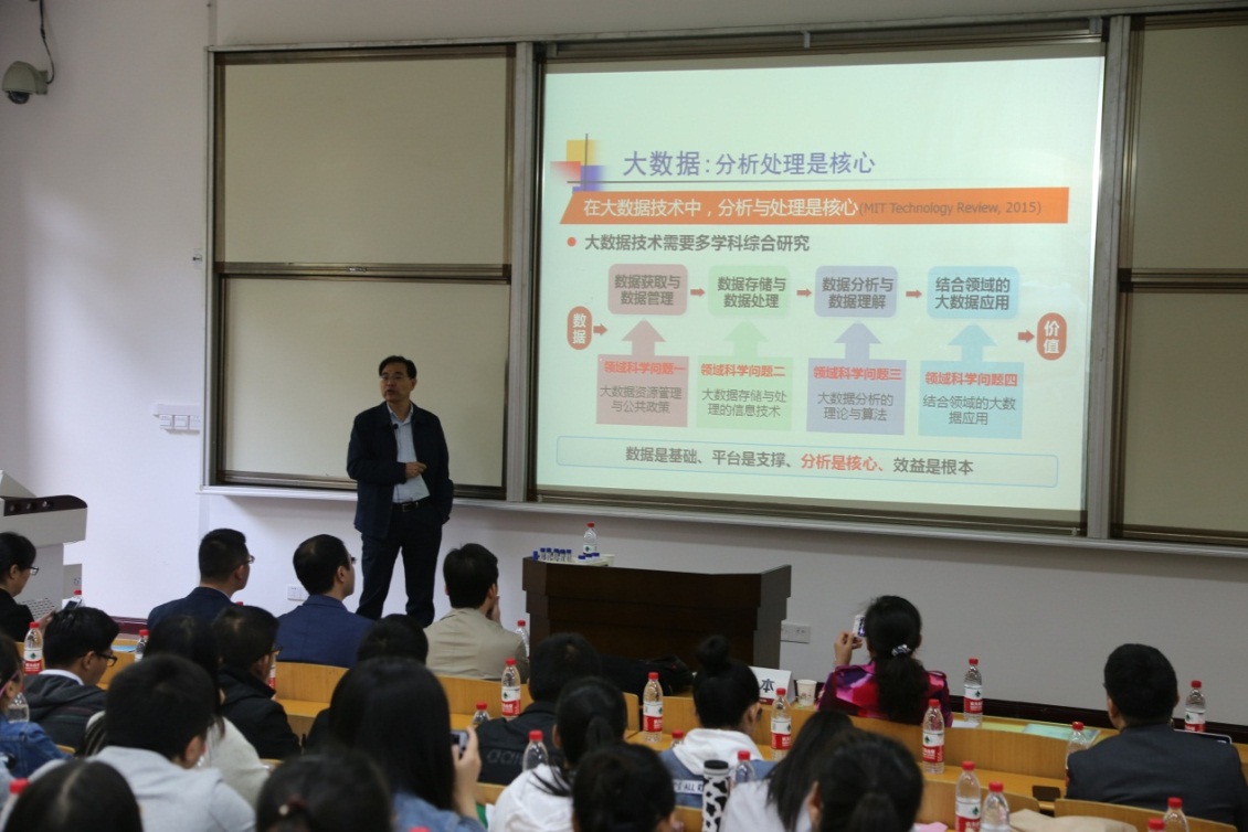 徐宗本院士的报告《大数据的基本问题与分析技术图谱》。徐院士以大数据的基本概念为起点,详细叙述了解决大数据问题的基本方法,并说明了目前在大数据应用的七个基本问题。他强调做大数据分析研究必须始终坚持以应用为导向,要利用大数据做出“数据产品”。徐院士语言幽默风趣,讲解深入浅出、通俗易懂,参加论坛的老师和同学都受益匪浅。