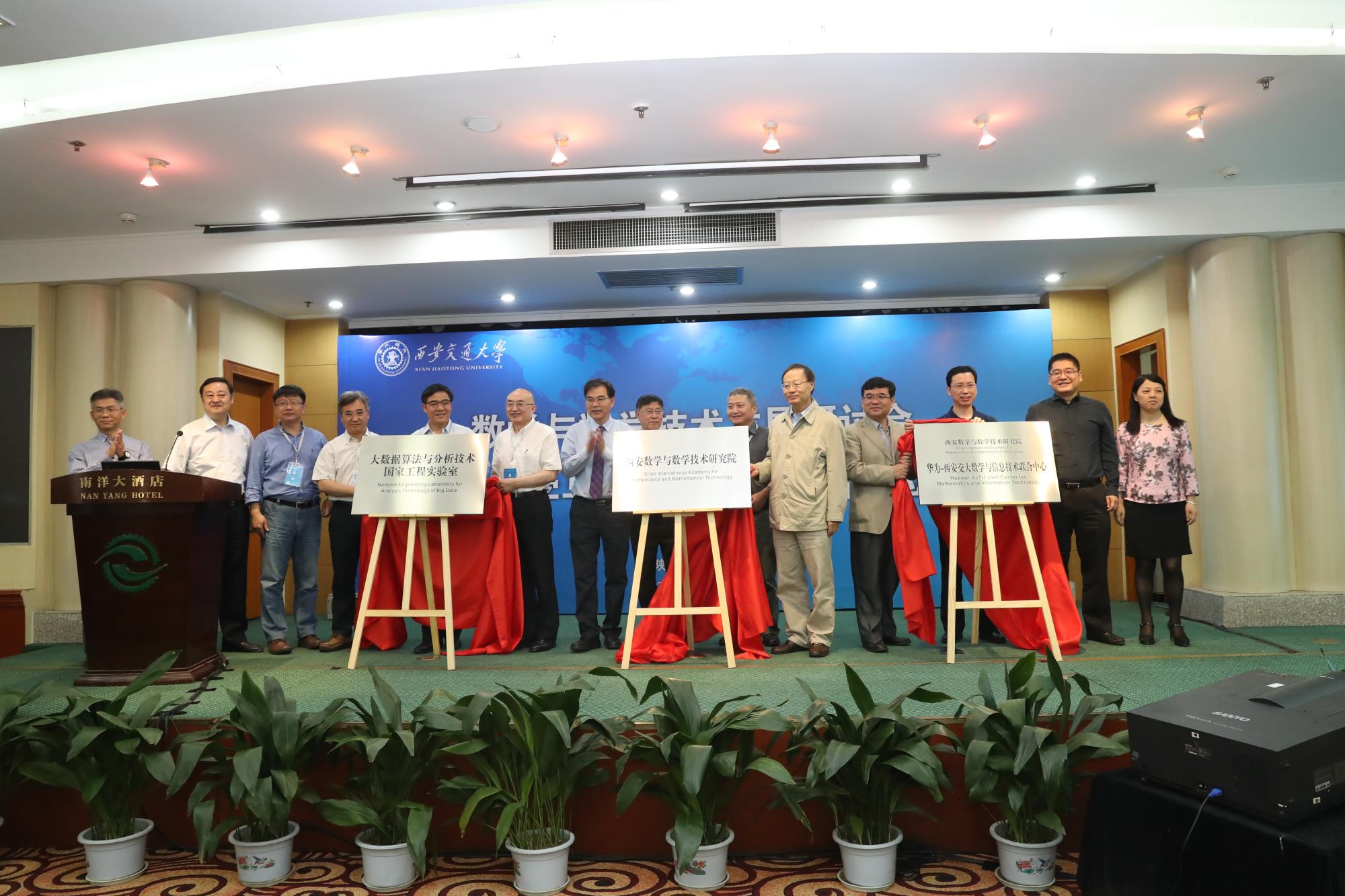 校领导和嘉宾代表共同为“西安数学与数学技术研究院、大数据算法与分析技术国家工程实验室、华为-西安交大数学与信息技术联合中心”等三个机构揭牌。