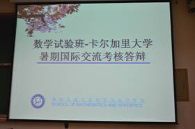 选派一二年级数学试验班学生6人赴加拿大卡尔加里大学进行暑期短期交流学习,他们已于9月前夕学习结束回国。按照试验班学生国际交流要求,9月27日下午数学学院组织了国际交流学习情况汇报考核会。朱旭、王卫、李丽敏、付利亚四位老师出席听取了每一位学生的汇报答辩。数学试验班一年级与二年级的其他同学也参加了答辩会。