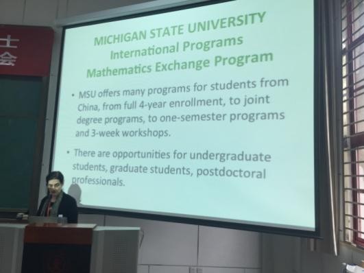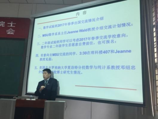 特邀美国密歇根州立大学(MSU)数学系主任Jeanne Wald教授,于4月8日下午为数学试验班学生介绍两校合作开展学生交流学习计划。