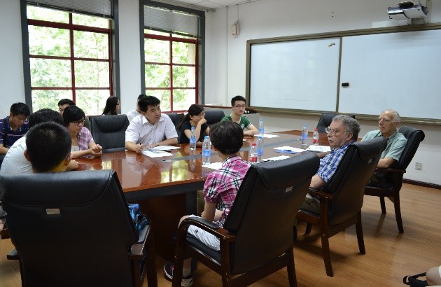 邀请,美国佐治亚理工学院数学系Jeffrey S. Geronimo和 Rafael de la Llave教授于6月21日—6月25日访问数学学院,并与试验班师生开展系列学术交流活动。6月24日上午9点,Prof. Jeffrey S. Geronimo与Prof. Rafael de la Llave在理科楼407会议室与数学试验班师生进行了深入地座谈。 座谈会由数学学院朱旭教授主持,数学试验班11级、12级学生参加了此次座谈会。