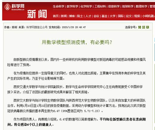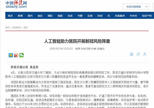 强化学科优势,助力精准抗疫。自疫情爆发以来,学院科研团队充分发挥学科优势,积极投入到与疫情相关的各项研究中。学院生物数学团队在2003年成功预测SARS流行趋势的基础上,与陕西师范大学生物数学团队、加拿大吴建宏教授团队合作,深入开展新型冠状病毒发展趋势和未来传播风险的研究,基于新型冠状病毒的传播机理、密切跟踪隔离和封城等策略,建立了符合实际的数学模型,对疫情发展进行了精准的短期预测,为国家疫情防控提供重要参考,相关研究成果被《科学网》专题报道。同时,为全力做好新型冠状病毒感染肺炎的防控工作,学院医学人工智能团队联合大数据算法与分析技术国家工程实验室、西安交大第二附属医院医学人工智能研究院技术力量,放弃春节期间休息,进行高强度攻关,为西安交大第二附属医院紧急开发出一套免费在线健康咨询、问诊与新冠风险筛查系统。通过这套系统,患者可直连西安交大二附院相关科室资深医生,进行远程健康咨询、问诊与新冠风险筛查。《中国科技网》专题报道了相关情况,该团队也在继续免费为全国各大医院、相关管理部门提供相关服务,为遏制疫情蔓延、打赢疫情防控阻击战做出贡献。
