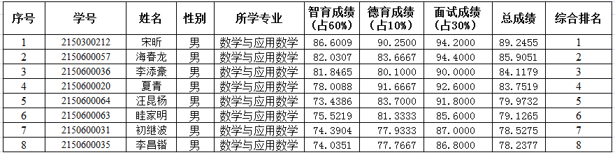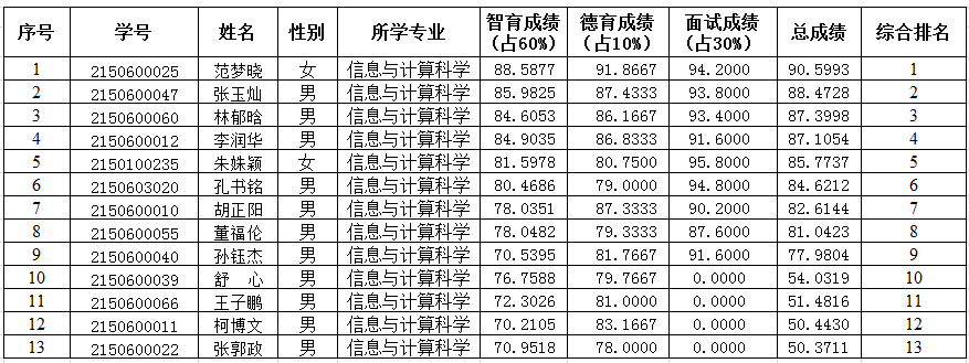2019届一楼一凤 拟推荐(候选)免试攻读硕士研究生成绩排名公示(学术型)