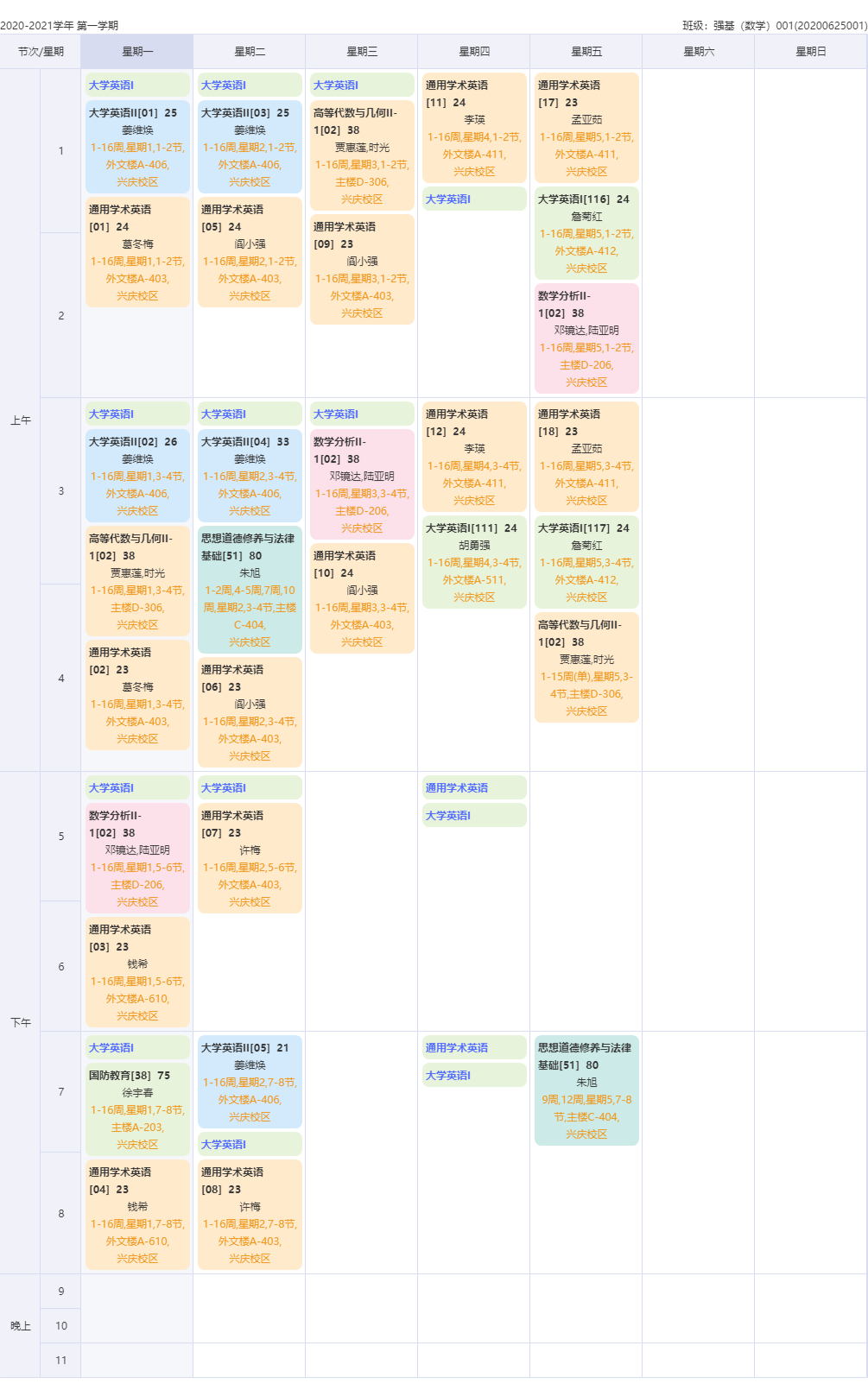 2020级强基(数学)班课程表