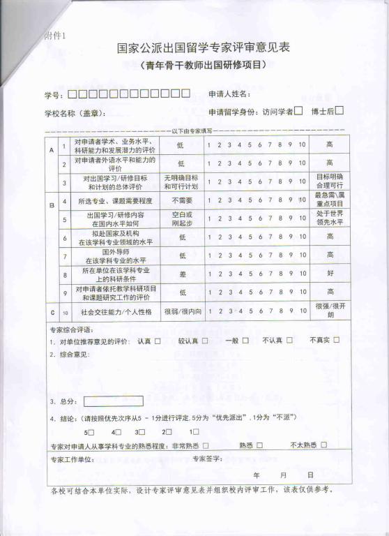 3、按照国家留学基金委新要求,原来要求提交的的研修计划专家组评审意见表,改用附件里《国家公派出国留学专家评审意见表》。