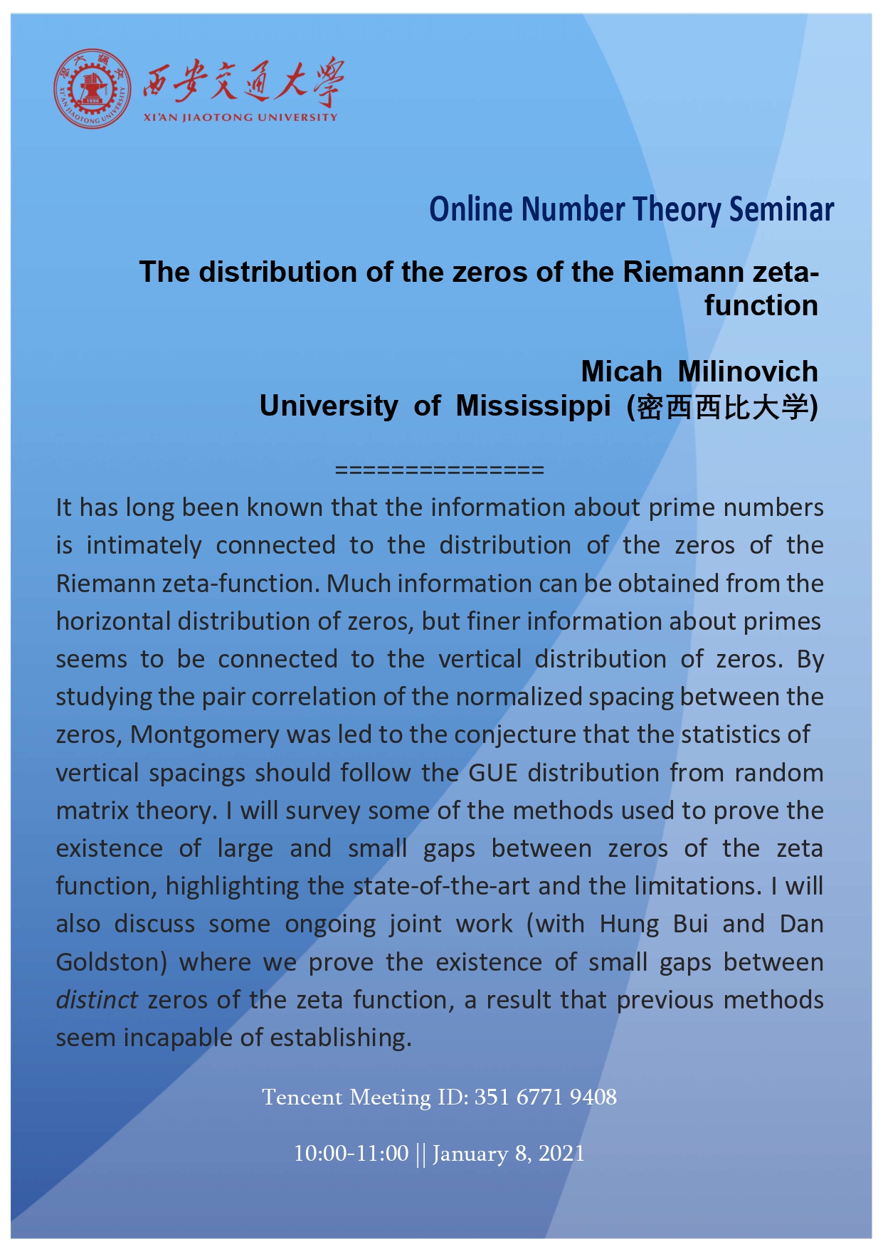 【数论线上论坛】美国密西西比大学Micah Milinovich教授学术报告通知