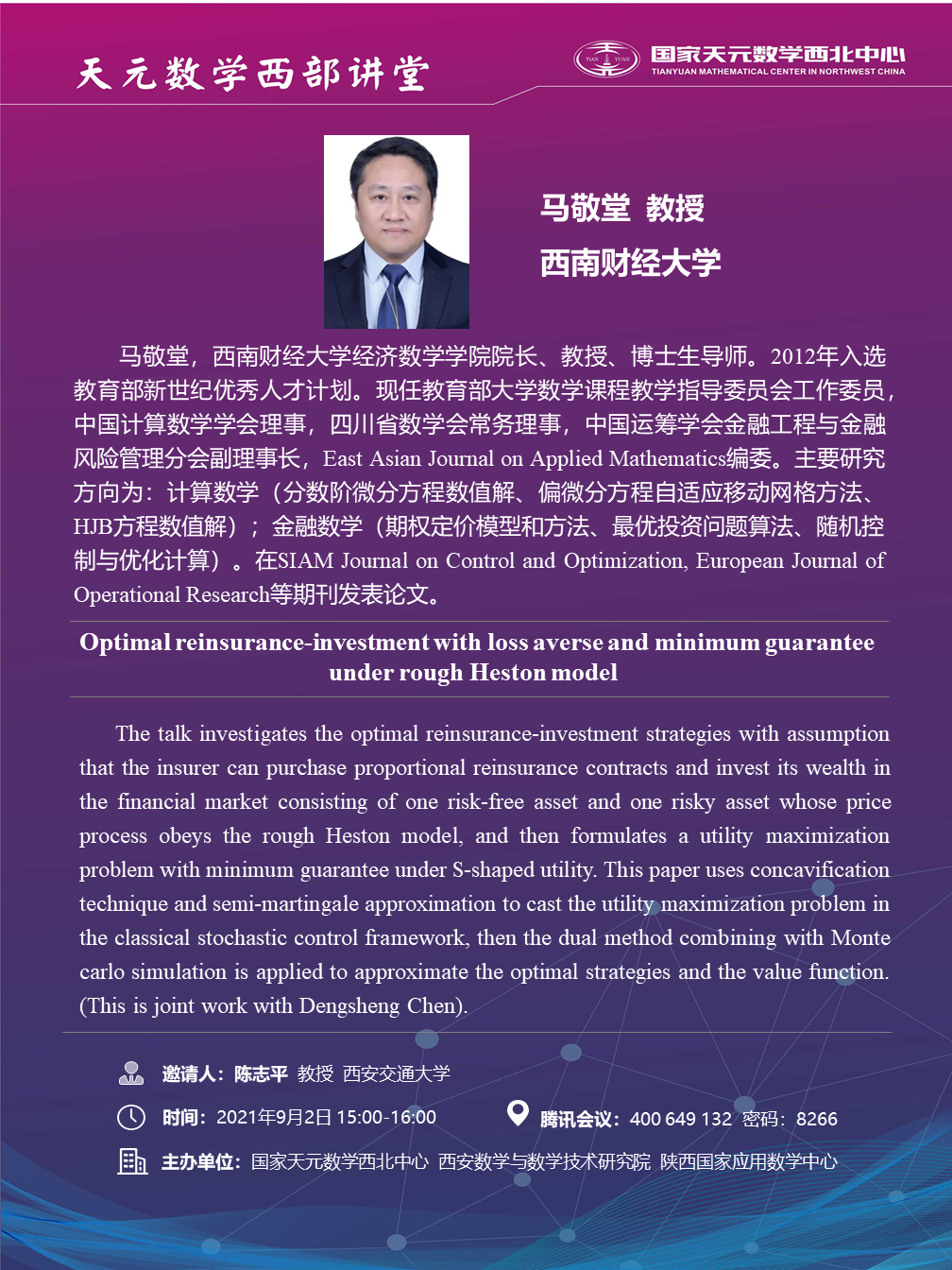 【天元数学西部讲堂】 Optimal reinsurance-investment with loss averse and minimum guarantee under rough Heston model