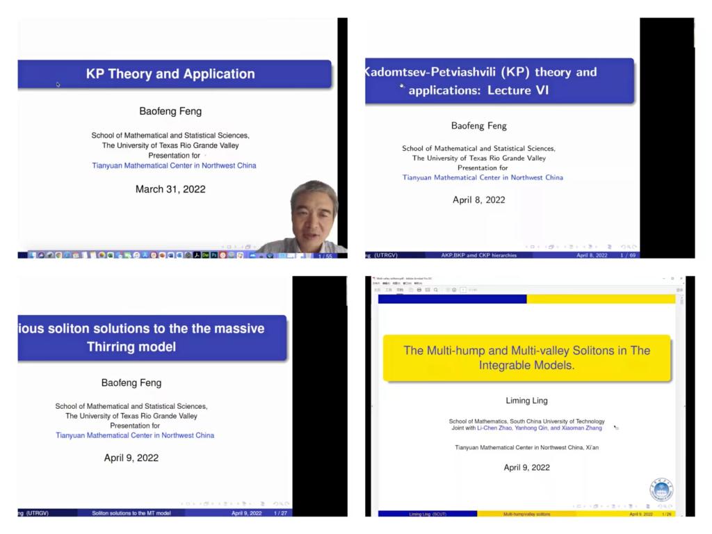 第一期活动的主题是“KP理论及其应用”,活动邀请美国得克萨斯大学大河谷分校Bao-Feng Feng 教授担任主讲人,详细讲授了KP约化理论和双线性变换方法。随后,邀请Bao-Feng Feng 教授和华南理工大学凌黎明教授作前沿学术讲座,分别报告了关于Massive Thirring模型和可积系统多峰多谷解方面的最新研究进展。