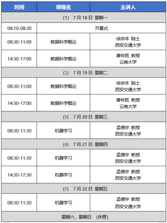 唐年胜院长担任活动召集人,共开设“数据科学概论”、“机器学习”和“数据智能”三门课程。培训班邀请数学科学领域知名专家授课,希望帮助与数据科学领域交叉的青年学者夯实基础知识、完善知识结构、提高研究水平。研修班拟定于7月17日报到,7月18日-29日在云南省昆明市线下授课,向统计专业基础课程教学教师倾斜。