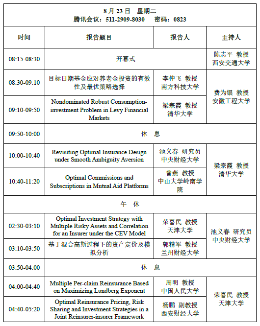 国家天元数学西北中心定于2022年8月23日-24日召开金融统计与保险精算前沿论坛。受疫情影响,活动全程在线上举办。该论坛是中心“随机分析与量化金融”主题年活动之一,拟召集国内随机分析、金融统计与保险精算交叉领域的知名专家,通过一系列学术报告使参会师生了解最前沿的学术热点与研究动向;汇聚随机分析、金融统计与保险精算的最新研究成果;探讨该领域发展中的基本科学问题,针对金融与保险的新需求提出随机分析、金融统计与保险精算的新方法;为国内随机分析、金融统计与保险精算交叉领域提供一个高水平的交流平台,促进我国统计学、金融数学的发展及西北地区大学相关学科教师队伍的培养。
