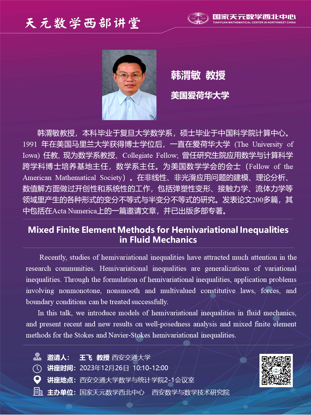 【天元数学西部讲堂】美国爱荷华大学韩渭敏教授学术报告