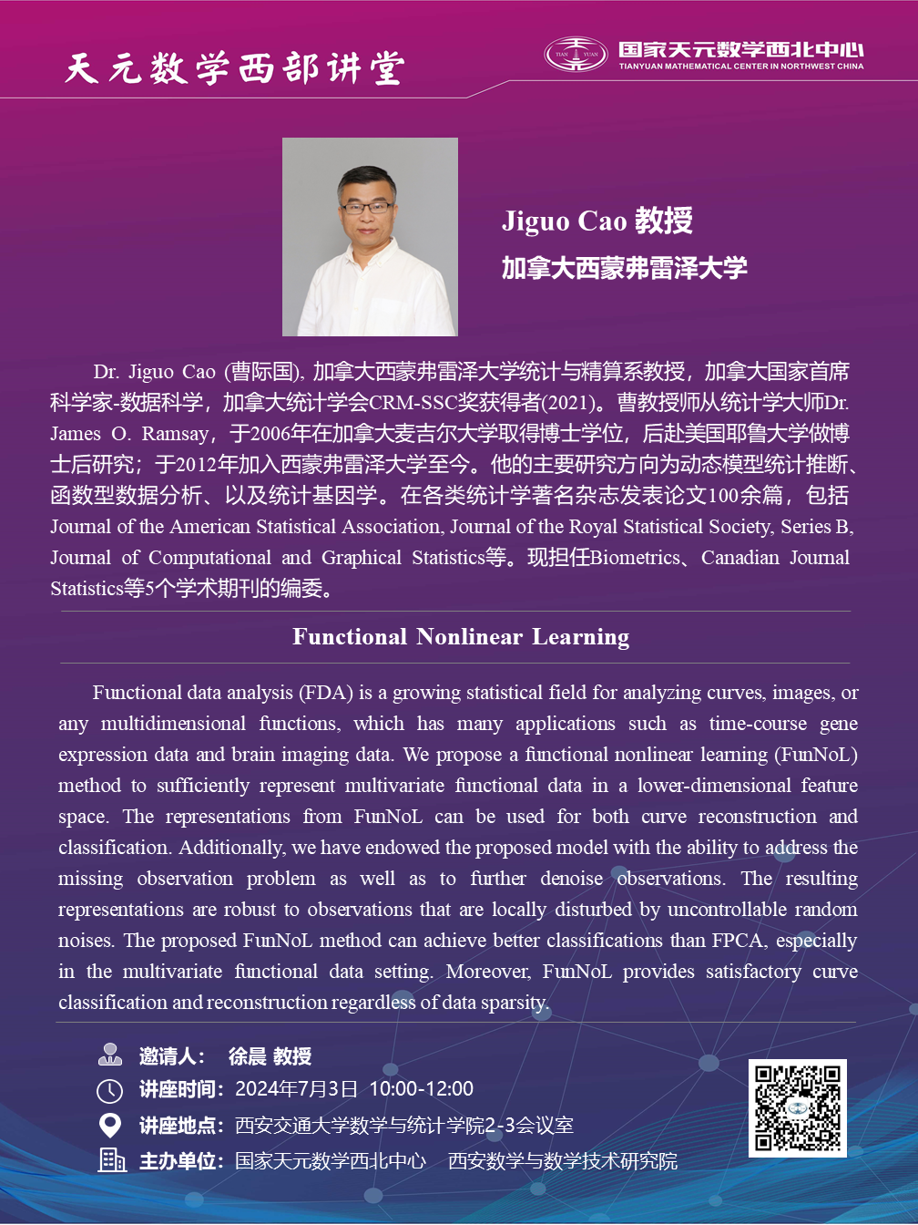 【天元数学西部讲堂】 加拿大西蒙弗雷泽大学Jiguo Cao教授学术报告