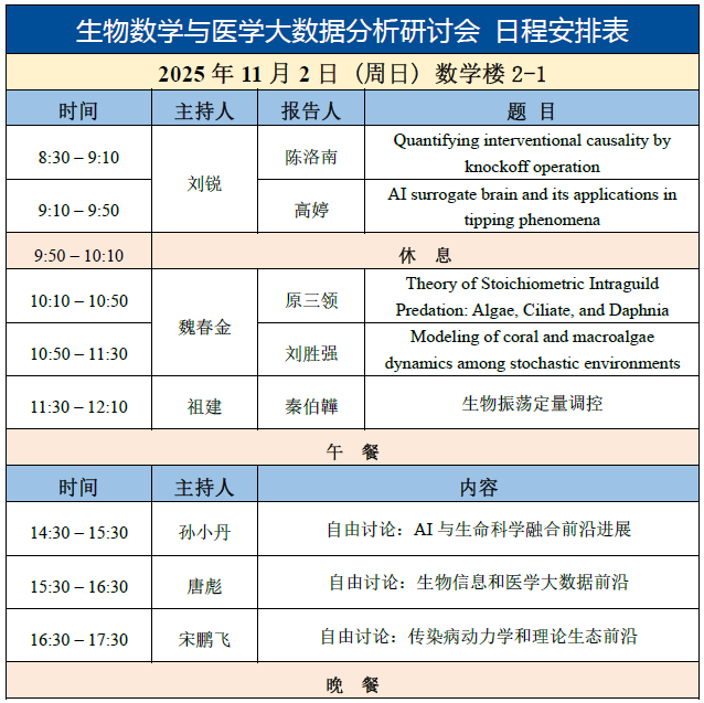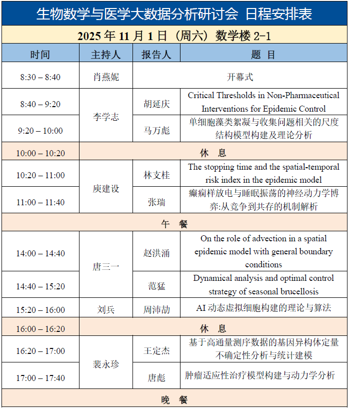 举办。本次研讨会的目的是交流生物数学、生物信息学和医学大数据分析领域的最新研究成果和发展动态。围绕生命科学、生物医学、理论生态等领域的实际问题,深入探讨数学、统计学与数据科学最新成果在生物、生态和医学等系统理论研究中的重要作用,通过问题驱动的理论研究促进生物数学、生物信息学和大数据科学的理论发展,提升采用统计与计算方法分析处理生物医学、生态学、农学等领域实际数据的能力。此次研讨会将为参会人员搭建学术交流、科学研究、合作分享的平台,为动力系统、微分方程、生物数学、生物统计与信息学、公共卫生和医学等方向的硕士生、博士生、博士后和青年教师提供良好的学习机会和交流平台。