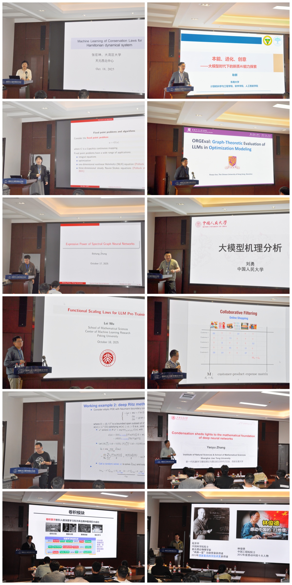 谢琦副教授分别作了专题报告。内容涵盖了大模型时代下的AI能力探索、大语言模型在优化建模中的图论评估、谱图神经网络表达能力、Transformer理论、能量视角下的架构设计、大模型尺度现象的动力学机制、低秩模型学习与推断、神经网络的数学基础以及几何等变先验嵌入的模块设计等多个前沿方向。与会学者围绕报告展开了深入交流,在思想碰撞中激发新的研究灵感与合作契机。