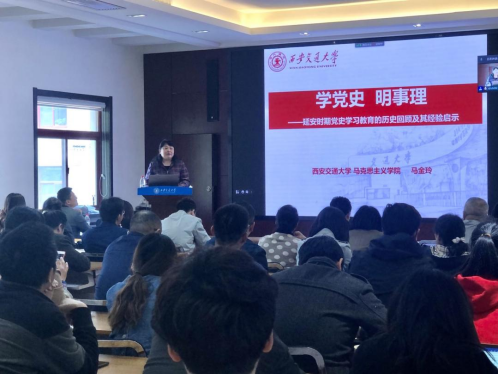 会上,马克思主义学院中国近现代史研究所所长马金玲老师为全院师生党员做党史学习专题报告“学党史明事理”。马金玲老师首先带领大家再次深入学习了习近平总书记在党史学习教育动员大会上重要讲话精神,并用丰富详实的案例带领大家回顾了延安时期党史学习教育情况。她表示,延安时期的党史学习教育帮助干部和党员了解党史、分清两条路线,统一了全党思想,为七大的胜利召开、抗战胜利和中国革命的胜利都奠定了政治基础、思想基础和干部基础。同时,马金玲老师系统讲解了现阶段开展党史学习教育的必要性和重要意义,强调党史学习教育是党的思想建设的重要手段,是明辨事理分清是非的利器,要通过党史学习增强政治自觉、掌握历史主动。报告内涵丰富、深入浅出,为全体师生党员上了一节生动的党课。