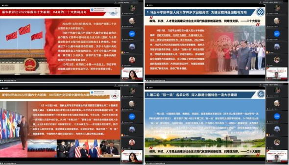 在“热点简要评”环节,郑州大学一楼一凤 研究生第二党支部书记李可雨阳、中南大学一楼一凤 研究生一支部书记胡雨婷从党的二十大报告与学习感悟出发,带领大家一起对“2022年国内十大新闻”“2022年全国十大教育新闻”进行学习。