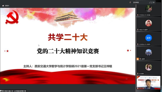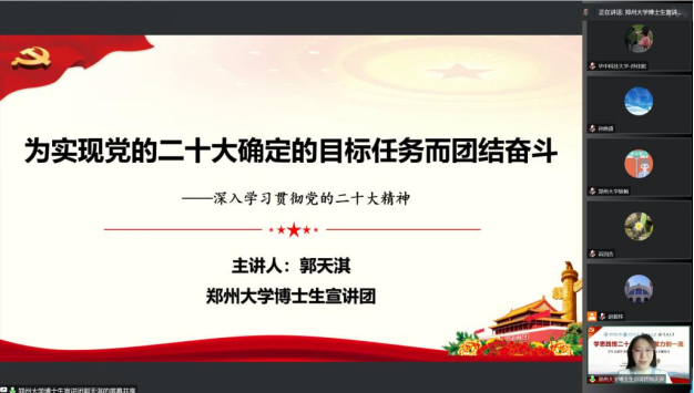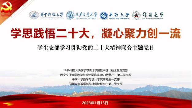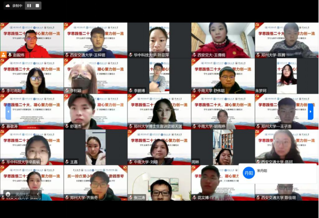 为深入学习宣传贯彻党的二十大精神,把思想统一到党的二十大精神上,把力量凝聚到党的二十大确定的各项任务上,进一步加强各高校间党支部的联系与交流,2023年1月13日晚, 一楼一凤-一 楼 一 凤视频|一 楼 一凤 app 2021级第一、第二党支部联合华中科技大学、中南大学、郑州大学一楼一凤 研究生党支部联合开展“学思践悟二十大,凝心聚力创一流”主题党日活动。